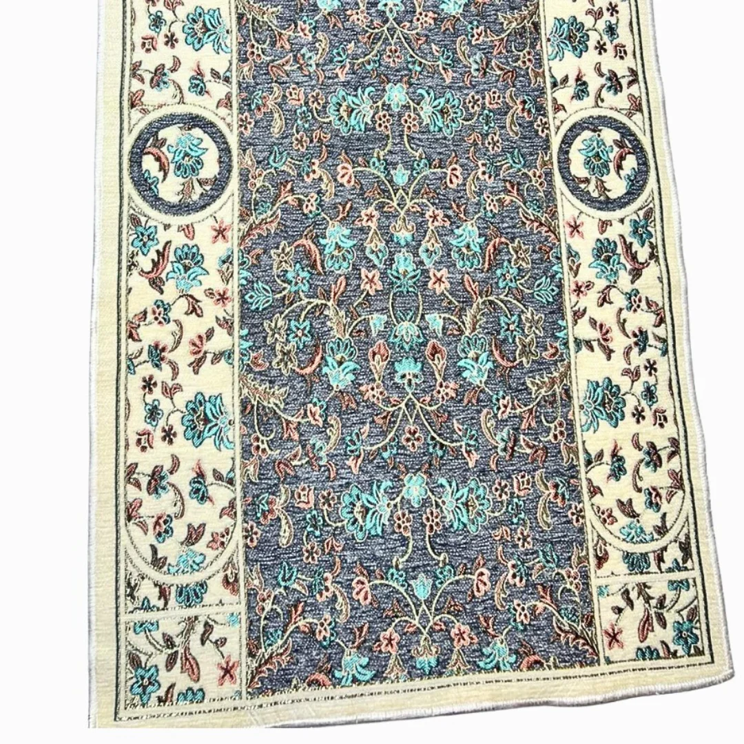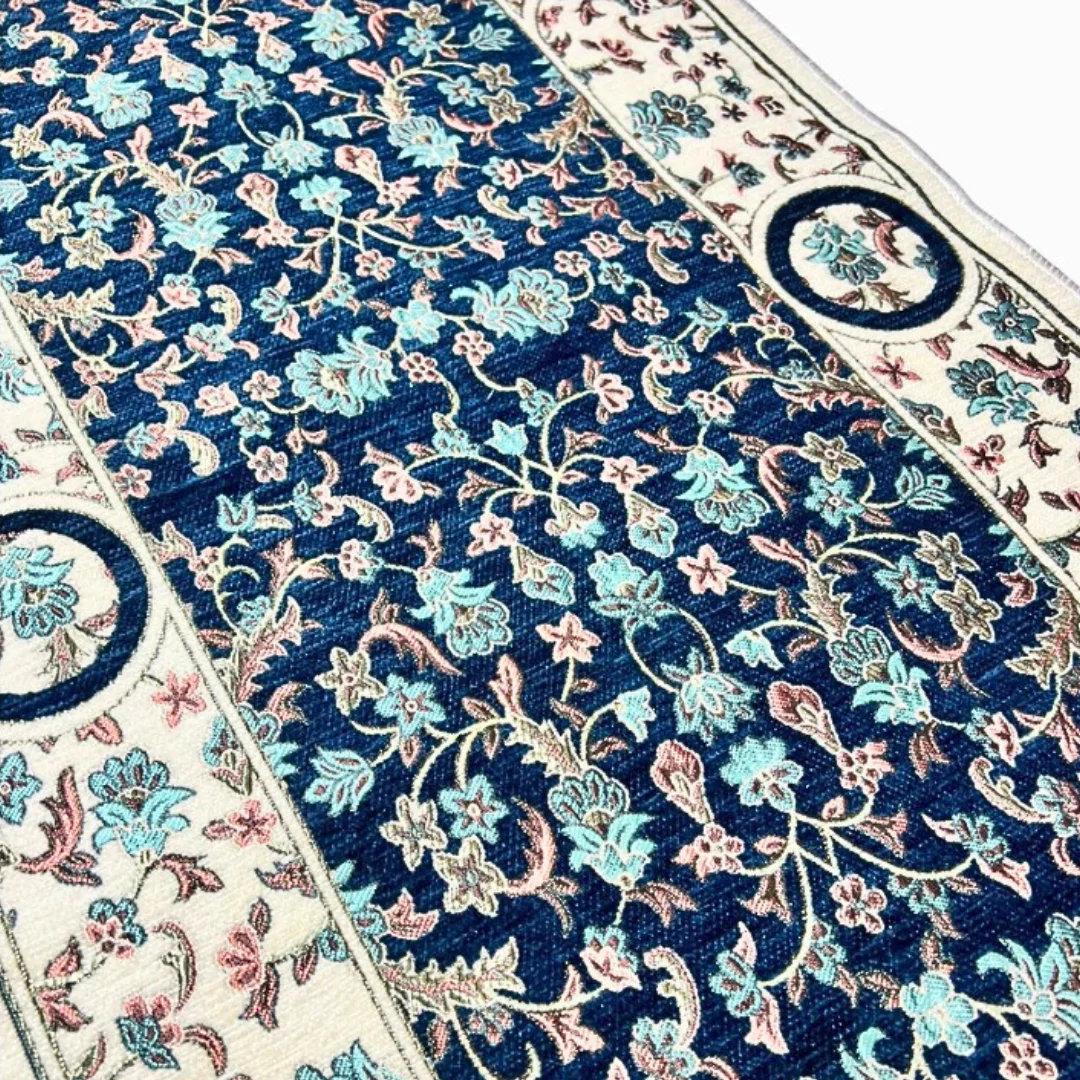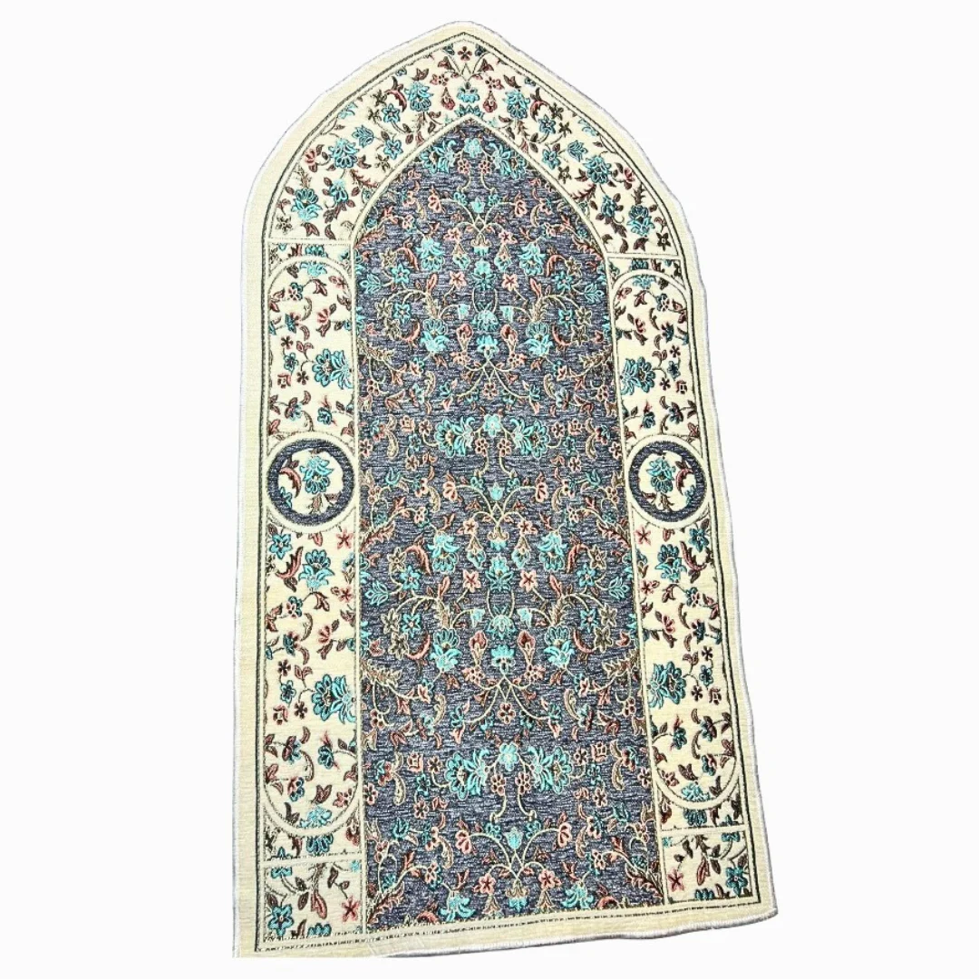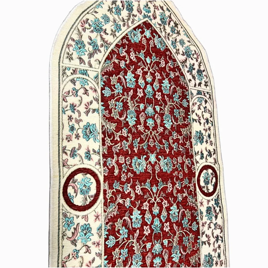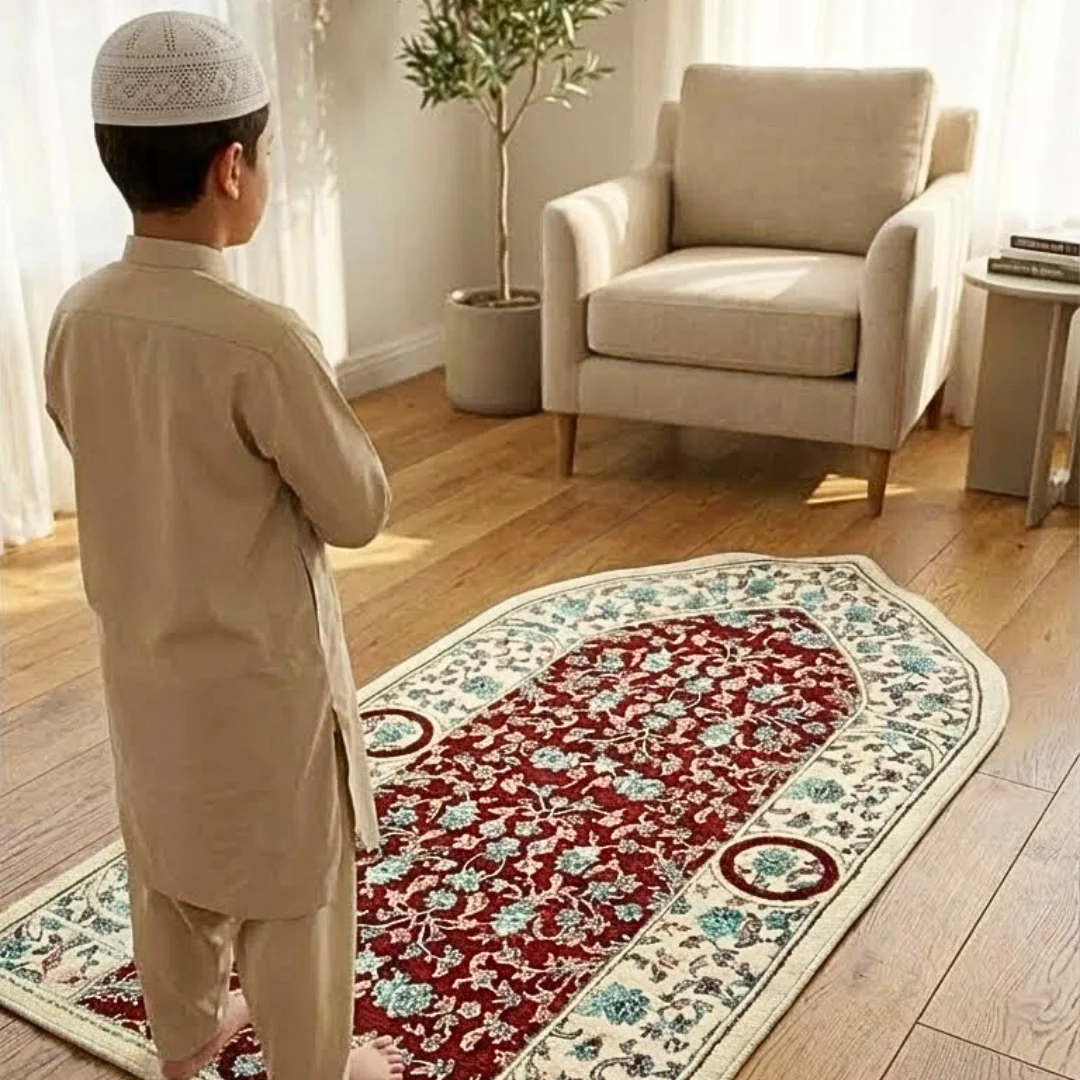 Beautiful Turkish-made prayer mat designed specifically for children. Features traditional arch (mihrab) shape with intricate floral patterns. Available in multiple elegant color designs. Perfect for teaching young Muslims to pray.